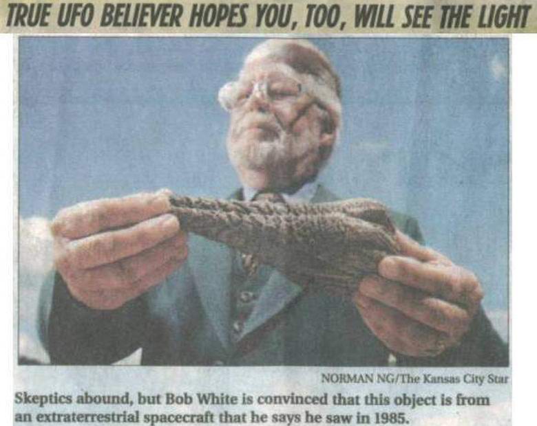 Bob večkrat ob tej priložnosti (o srečanju z NLP in darilom vesoljski artefakt) govoril po televiziji, pisal o njem veliko časopisov. Moški je dvakrat opravil poligrafski test. Detektor laži je pokazal, da Američan govori resnico oz vsaj on popolnoma verjame v svoje srečanje z NLP-ji. Kot, mimogrede, in njegovo stari prijatelj. Razlog, da je bil artefakt danes razstavljen prodaja se ne kliče. Mogoče je Bela samo potrebna denar. Obljubil je, da bo poimenoval stroške samo za tujek predmeta potencialni kupec in samo osebno. Adijo upoštevajte, da ni bilo niti ene osebe, ki bi to želela kupiti fantastična kapljica …