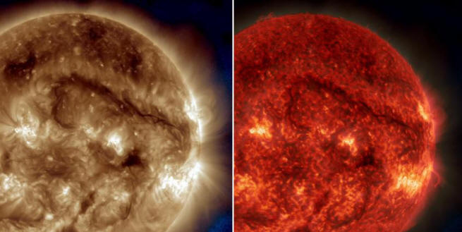 Fotografija iz odprtih virov To velikansko vlakno so videli in sledil več dni, medtem ko se je vrtel naokoli Sonca. Opazovanja so bila izvedena s pomočjo Sončnega observatorija Dinamika (SDO) NASA. Ta opazovalnica nadzira Sonce 24 ur na dan. Če se takšno vlakno potegne, potem ga sega skoraj do premera Sonca, ki predstavlja približno v 100-krat večji od premera Zemlje. S pomočjo SDO smo dobili posnetki vlaken v različnih območjih valovnih dolžin, kar pomaga poudarite materiale pri različnih temperaturah. Preučevanje sončnih vlaken v različnih območjih valovnih dolžin in na različne temperature lahko znanstveniki dobijo več informacij razloge za pojav takšnih struktur, pa tudi dejstvo, da je katalizator za velikanske emisije v vesolje prostor. Slika na levi je bila dobljena s kombiniranjem ekstremno ultravijolično (UV) sevanje z valovno dolžino 193 in 335 angstromov. Slika na desni se tudi ujema ekstremno UV sevanje z valovno dolžino 304 angstromov.