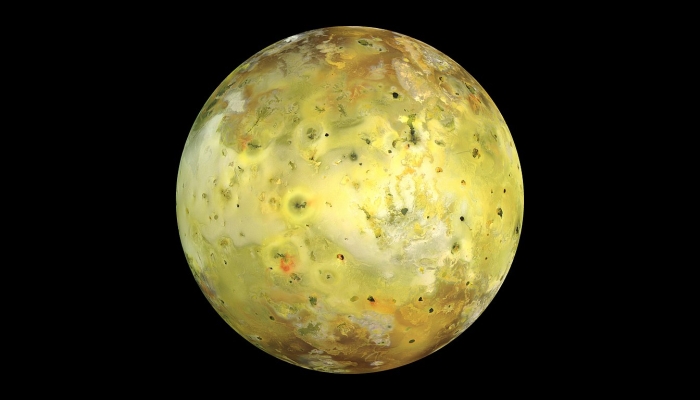 V tanki atmosferi in na površini Io je žveplov dioksid prevladujoč – da, žveplo – se izloča od znotraj. Skozi vulkanske razpoke bruha plin in se ponoči usede na tla, hladi in daje satelitu rumene in oranžne odtenke.