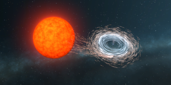 Beli škrat, ki se vrti, medtem ko absorbira snov iz svojega spremljevalca. (Center odličnosti ARC za odkrivanje gravitacijskih valov)