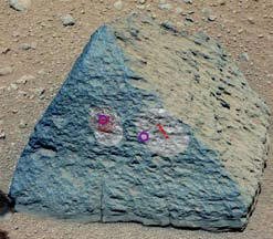 Prvi kamen, ki ga je preučil Curiosity s Rentgenski spektrometer Spominja feldspar – veliko jih je kalij in natrij ter malo magnezija in železa. Izgleda, da je kometov meteorit, saj je njegova kemična sestava zelo značilna za večino raziskovanih fragmentov kotarjev.