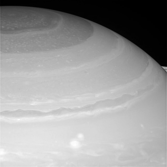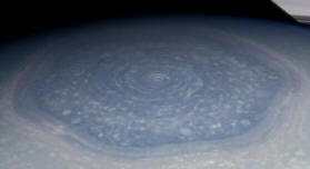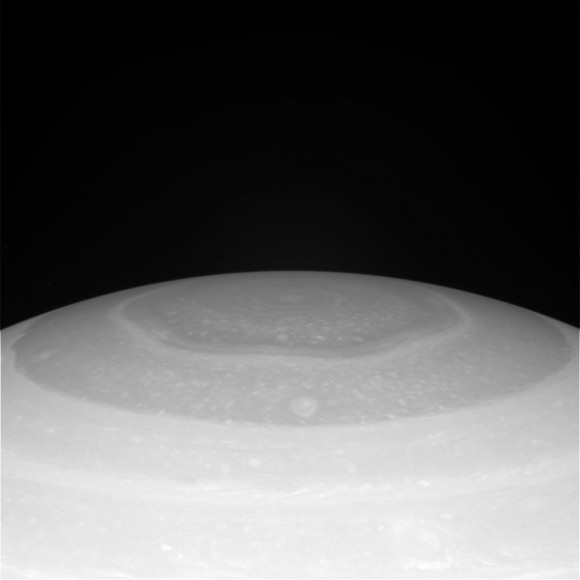 Prej smo imeli priložnost videti fotografije velikana vrtinec, tako silovito divja na severnem polu Saturna. Zdaj je naprava »stopila nazaj«, da bi predstavljala eno najbolj neverjetne lastnosti obročanega velikana – velikana šesterokotnik, ki se nahaja na severnem polu Saturna. Kompozitni barvna slika, ustvarjena iz serije fotografij, prenesenih v Cassini 28. novembra. Slike so bile posnete z razdalje 610.373 km. Na fotografiji jasno vidne spremembe senčil po severni polobli Saturn, pa tudi jasen geometrično pravilen šesterokotnik zgradba