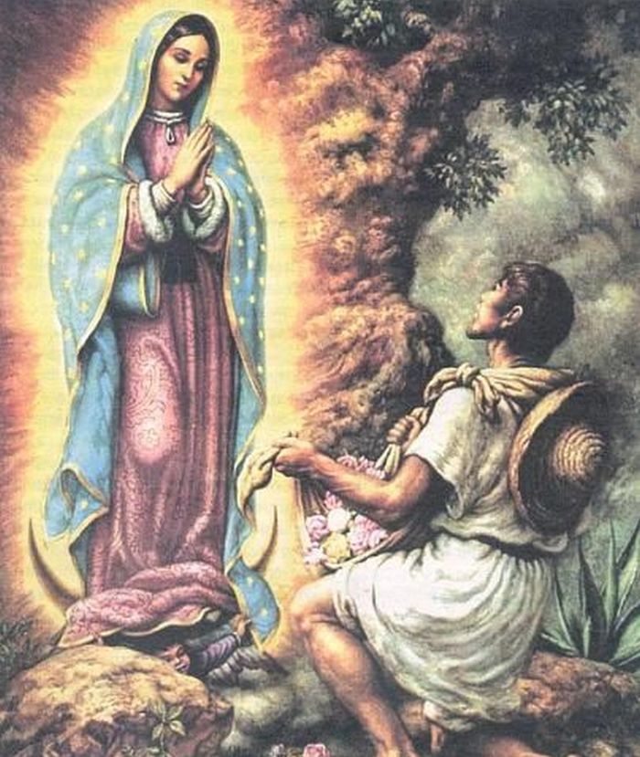 Ker je bila cerkev od nje štirinajst kilometrov doma, na poti, ko je moral Juan nekoč obiti hrib Tepeyak nekdanje starodavno svetišče Aztekov. Vendar je tokrat nekaj šlo ne čisto običajno, saj je čudovita glasba prihajala s hriba in presenetljivo sladko petje. In potem je tudi Diego priklical prijazno ženski glas. Bila je Blažena Devica. Ni jasno, kako Juan je določil, da gre za prav Gospe, domnevati je treba, da za bila je predvsem boginja Tonatsin, še posebej, ker je po Aztekov opis, ženska je bila črna, kar ni ravno dosledno s tradicionalno podobo matere Jezusa Kristusa.