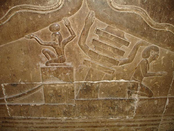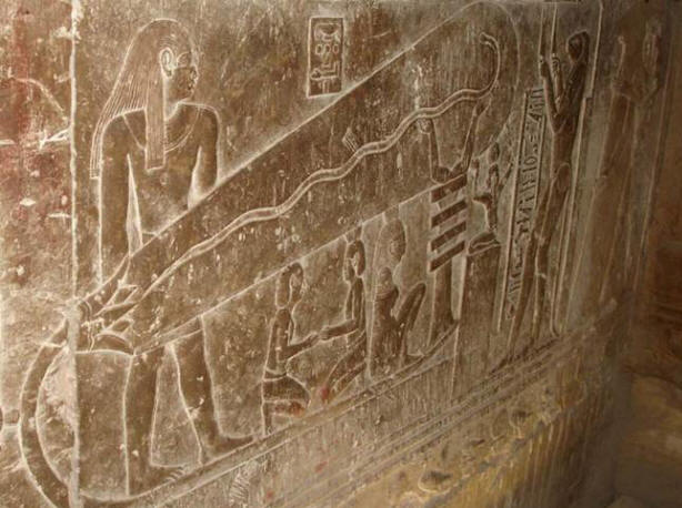 Obstajajo kritični razlogi, ker sliko spremlja samo hieroglifi neke verske hvalnice, posvečene bogu soncu – Ra. To je egiptologom omogočilo, da opustijo vse neformalne hipoteze in samozavestno razloži piktograme, ki prikazujejo skrivnost templja s nebeški čoln sončnega boga Ra. Po verovanju Egipčanov sonce vsak dan umre zvečer in vstane ob zori. Tu ga je simbolizira kačo, ki je, kot so verjeli v deželi faraonov, prerodi se vsakič, ko odlepi kožo.