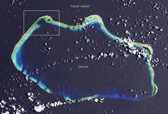 Atol za bikini, 19. avgust 2013. © NASA Po eksploziji v tleh Na atolu in na sosednjih območjih morskega dna se je pojavil lijak s premerom približno 1,8 kilometra. Napolnjena z vodo se je zelo spremenila Obrisi atola bikini.