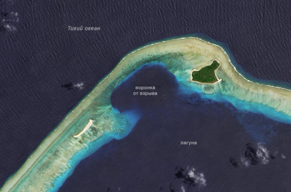 Lijak iz jedrske eksplozije. © NASA, 19. avgusta 2013, satelit Landsat 8 je fotografiral atol. Trenutno velikosti toka sta široka dva kilometra in globoka 80 metrov. “Grad Bravo “(tako je bilo ime te operacije) je postal najmočnejši vsi jedrski testi ZDA. Kot posledica resnega sevanja onesnaževanje okolja so bili pogledi na jedrsko orožje revidiran.