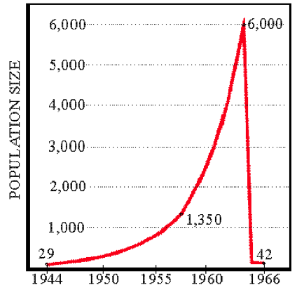 Slika 4. Spremembe števila jelenskih čred na otoku Svetega Mateja, kaže študija Davida Kleina iz Univerza na Aljaski