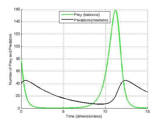 Slika 3. Pladnji – model Volterra, uporabljen za demonstracije situacije, ki se začne z 80 babuni (zelena črta) in 40 geparjev (črna črta)
