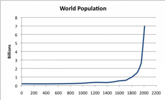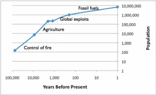 Močno povečanje števila sovpada z obdobjem proizvodnje in uporaba fosilnih goriv in se začne v začetku 19. stoletja. Če pa pogledamo še zgodnejše časovno obdobje, potem glej, da je bila rast opažena v zelo dolgem obdobju. Človek se je naučil uporabljati ogenj pred več kot milijonom let. A od 75 tisoč let pred našim štetjem je rast števila ljudi postala precej stabilen: