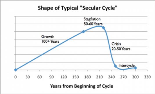 Slika 7. Tipičen graf dolgega cikla gospodarska dejavnost, zgrajena po Petru Turkinu in Sergej Nefyodov: rast – 100+ let, stagflacija – 50–60 let, kriza – 20-50 let, prehodno obdobje