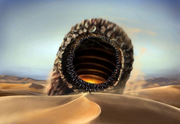 Med drugimi dokazi avtor podaja zgodbo o mongolščini stari Tseven, prebivalec vasi Dalandzadgad, ki je to trdil Olgoi Horkhoi živi 130 km jugovzhodno od regije Aimak. Tseven s prestrašen nad temi ogabnimi in groznimi bitji. Te Efremov je zgodbe uporabil pri pisanju fantastične zgodbe, ki se je prvotno imenoval – “Allga-Horha.” V zgodbi govorilo se je, da sta zaradi strupa velikanskih črvov umrla dva Rusa raziskovalci. Kljub temu, da je bilo delo v celoti izumil, temeljil je izključno na mongolskem folklora.