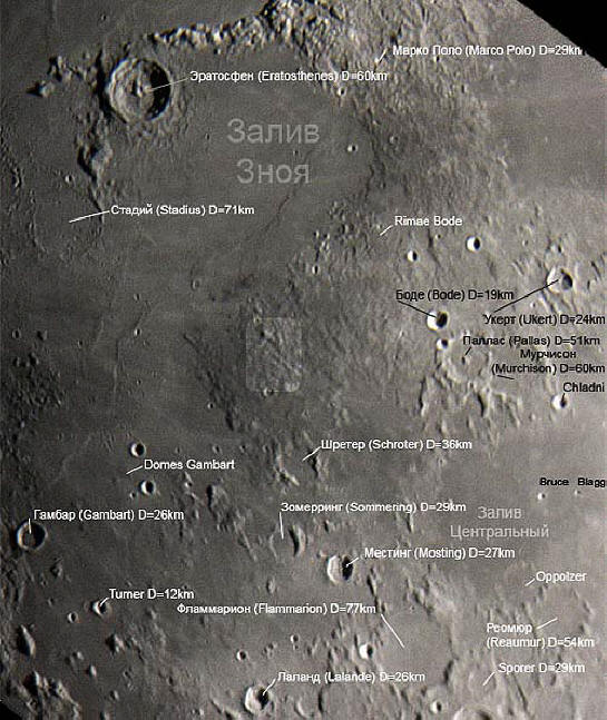 Pogledi na “mesto Gruituisen” na luni. Na spodnji fotografiji je poudarjeno beli pravokotnik. Razkropljen krater Schröter, zgoraj in na levi strani “mesto Gruituisen.” (Iz gorovja zgoraj in na levi izgleda “božično drevo” krater z osrednjim hribom)