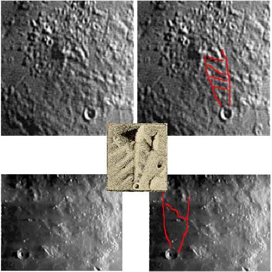 Sredi lunarnega dne, ko je sonce največ višina nad obzorjem postane skrivnostna veriga opazna razporejeni v parih svetlih lis, ki se omejujejo z dveh strani temno ukrivljen trak. Z zahoda in vzhoda se “mesto” širi čudna trikotna »polja«, prekrita z omedlevico črte.