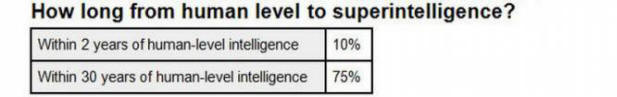 10% znanstvenikov verjame, da se bo čez nekaj let pojavila superinteligenca; 75% vprašanih meni, da se bo to zgodilo čez 30 let.