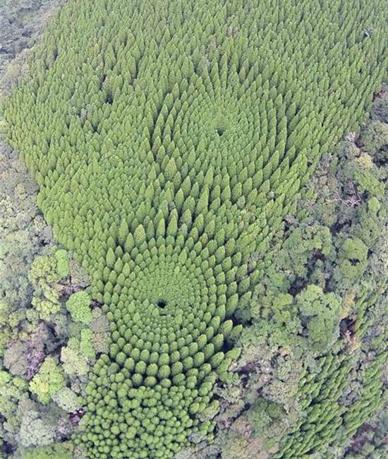 Pred skoraj pol stoletja zaposleni na japonskem ministrstvu to so dali kmetijstvo, gozdarstvo in ribištvo mesto statusa tako imenovanega “poskusnega gozdarskega pasu”. Strokovnjaki so posadili mlade cedre pod kotom deset stopinj do dobite skupaj dva kroga, od katerih bi vsak imel po deset koncentrični obroči. Po dolgih letih edinstvena izobrazba drevesa so postala jasno vidna na satelitskih fotografijah.