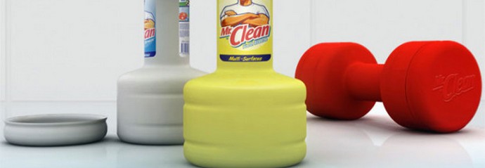 Embalaža detergentov z dumbbell. Zdaj gospodinje bodo lahko gradile mišice in ne samo brisale kuhinjo plošče.