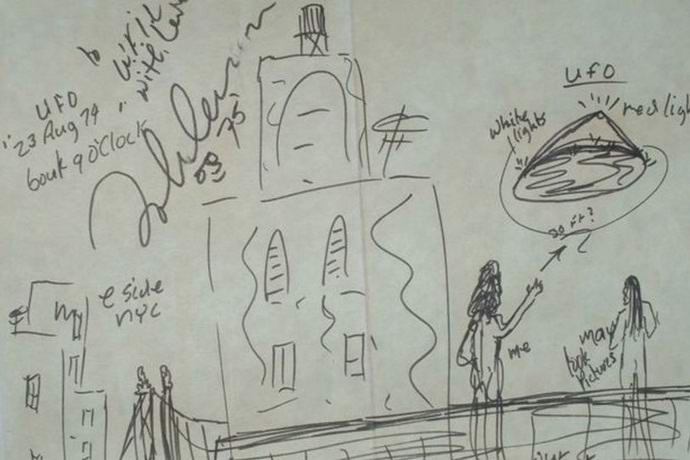 Dokazi o Lennonovi veri v tujce so že bili najdeni. Leta 1984 je na primer izdal pesem “Nobody Told Me” v ki ima naslednjo vrstico: “NLP je lebdel nad New Yorkom, a jaz ne še posebej presenečen. “In lani britanski ufolog Russ Kellett kupil od zasebnega zbiratelja redko skico na papirju, narejen po roki najbolj znanega in cenjenega Beatla. Na Na tej shematični risbi si lahko ogledate več hiš, Brooklyn Bridge, glasbenik sam, neka ženska v njegovi bližini in tudi leteči krožnik. “Bele luči, rdeče luči,” se glasi Podpis pevca do različnih elementov tujega letala. Mimogrede, to je zelo pogost opis NLP – takih predmetov najdemo ga skoraj v vseh krajih zemlje.