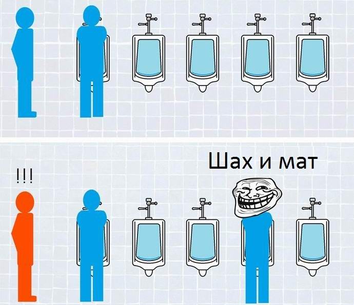 Matematiki so opravili stroge izračune, kar je povzročilo ugotovili, da je najugodnejši položaj za spopadanje z majhnimi potrebami v javnem WC-ju je pisoar, ki je najbolj oddaljen vhodna vrata. Če ga zasedete, najverjetneje izzovete drugi moški, ki gredo na stranišče, da bi dobili pisoarje, ki se nahaja skozi enega od zaseden. Tako med vsemi obiskovalcev stranišča bo vsaj en prazen pisoar. To bo vsakemu od moških omogočilo, da ne ostane samo osebno prostora, pa tudi v skladu s pravili “toaletnega etiketa” v skladu s katero delovanje vseh pisoarjev zapored, pa tudi spremljanje sosedje in pogovor z njimi so nesprejemljivi.