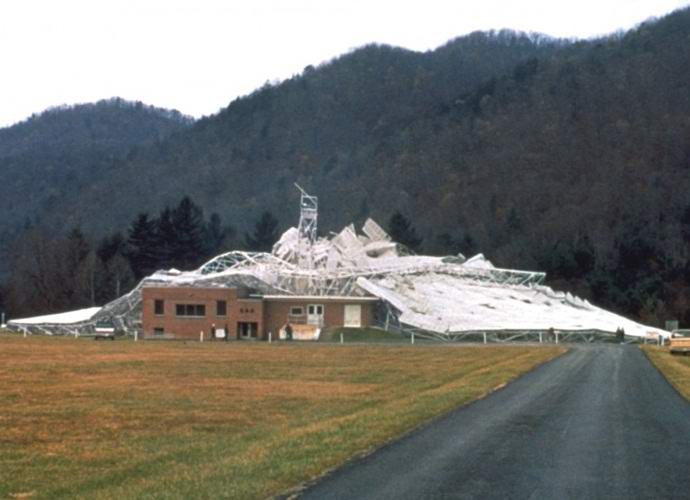 Veličastna gradnja je Američanom redno služila bolj četrt stoletja, in nič ni kazalo na težave. Ne manj, na en lep in povsem miren dan anteno nenadoma razbit na koščke in se zrušil na tla v večtonski kup kovinski naplavin. Na prizorišče takoj Za preiskavo nesreče je prispela posebna komisija. Vendar preiskava ni potekala dolgo, ker strokovnjaki domnevno ni mogel najti vidnih vzrokov za zrušenje teleskopa. V v uradnem poročilu je bilo navedeno, da je “kriv aluminijaste konstrukcije. ”
