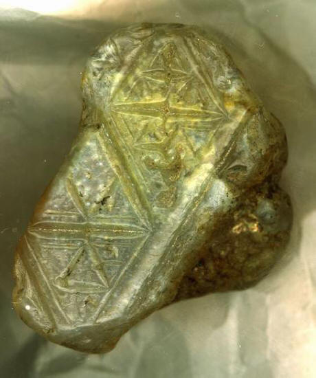 Med temi koščki kvarcita so eksplicitni artefakti po navedbah vsaj dva. Eden od fragmentov (na sliki) vsebuje 4 simboli, zaprti v trikotnike (so dvojni in zaporedni medsebojno povezan z notranjim pomenom), drugi je manjše velikosti in škodovalo več – nevarnosti trikotnikov in notranjih slik delno prebrano.