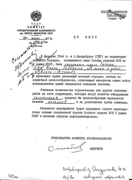 Leta 1970 so ozemlje zasedle sovjetske čete mesto v Magdeburgu je bilo preneseno na oblasti NDR. Ponovno se je pojavilo vprašanje o posmrtnih ostankih Fuhrerja in pokopan z njim (skupaj 10 trupel). V pohodu 1970, predsednik KGB Andropov je poslal Brežnjevu, v ki je ponudila odpreti grob, uničiti ostanke pekoč. Vaš pritrdilni vizum na dokumentu, ki ni Brežnjev zapustil Kosygin in Podgorny. Operacija uničenja ostankov prejel ime “Arhiv”.