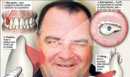 Anglež Martin Jones je slepo desetletje slep. Avtor vendar je leta 2009 dobil vid. Zgodilo se je po zelo nenavaden medicinski postopek: zdravniki so ga vsadili v oko fragment zob. Bila je pega, ki so jo zdravniki potegnili iz ust. Jones.