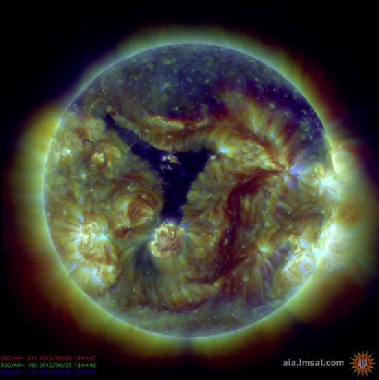 Fotografija iz odprtih virov Slika Sonca, 13:44 uri GMT 25. junij 2013 © SDO | NASA Od Coronala luknje so območja, na katerih je magnetno polje odprto, in sončni veter lahko mirno odteka v vesolje, takrat se lahko na Zemlji začnejo magnetne nevihte. Po izračunih geofizikov NASA, to se bo zgodilo 29. do 30. junija. Vpliv se bo dotaknil prej skupno polov, kjer je treba pričakovati polarne luči.