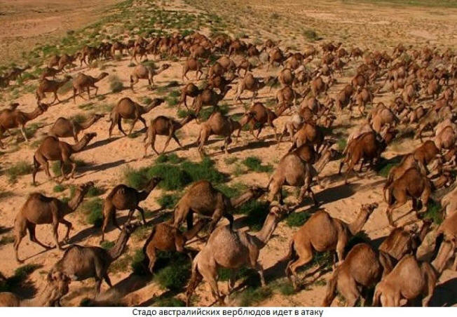 Kamele se seveda niso pasle kot zajci in še njihovo število je vsako leto raslo. Kmalu so začeli hoditi naprej Črede Avstralije, ki jih ni niti v Egiptu niti v ZAE. Čred kamel – tudi to je darilo. Kam so šle kamele – nihče ne ostane nič, niti zajcev: vse bodo poteptali in pojedli vse. Kamel lahko 8 dni, da ne pije, a ko je dosegel vodo, je sposoben 10 minut pijte do 100 litrov tekočine. Kdaj torej v oazo naenkrat 200 kamel pride gor, oaza je že obsojena: prej bodo spili vso vodo zadnja kapljica in pojej vse zelenice do zadnjega rezila trave.