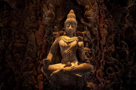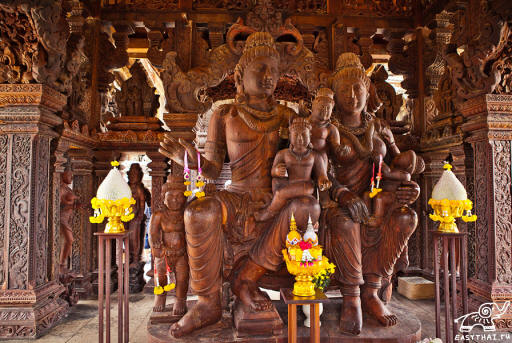 Fotografije iz odprtih virov Notranjost templja je razdeljena v 4 dvorane, od katerih vsaka spada v eno glavnih religij Jugovzhodna Azija, čeprav načeloma ni mogoče ločevati religije in v vsaki sobi se med seboj prepletajo. Prva dvorana Tempelj resnice – kozmogonska prepričanja. Filozofija Jugovzhodna Azija navaja, da se človek ne more roditi obstajajo brez sedmih ustvarjalcev. Notranjost templja resnice nam daje priložnost videti 7 ustvarjalcev v podobi lesenih kipi. Sem spadajo: Nebo, Zemlja, oče, mati, Luna, Sonce in zvezde. Tu so upodobljeni tudi bogovi planetov, od katerih je vsak ustreza dnevu v tednu. Vplivajo na ljudi in tekom svojega življenja. Če veste, kateri dan ste se rodili, lahko vidite, kateri planet je za vas osnovno. Sonce predstavlja čast in blaginjo – vstajenje; Luna predstavlja čast in blaginjo – Ponedeljek Mars – pogum in industrija – torek; Živo srebro – prijaznost – okolje; Jupiter – Modrost – četrtek; Venera – bogastvo – petek; Saturn – beda in trpljenje – sobota. Vsak od skulpture, ki simbolizirajo planet, ki ga predstavljajo različni različice podobe Krsne. Druga soba je namenjena verovanjem. Hinduizem Tu so epizode iz Krišnavatarja, 8 reinkarnacija Višnuja. Upodabljajo Krišno na kravi Vardhana, Krišna stoji na glavi serpentina, ki je Naga, Krišna in pastirji in Krišna na gugalnici z Radho. Napoved o razumevanju cikla rojstvo in smrt je glavna pridiga Vishnuja in ena izmed najbolj znana hindujska besedila. Tretja dvorana predstavlja Kitajski budizem. Napolnjena je z lesenimi skulpturami. Kitajska nadnaravna bitja, vključno z obojestransko obalo Budistična veja Mahajame. Bothisattva je najvišje dosežena oseba. modrost, vendar je odklonil nirvano in se odločil ostati med ljudmi, da bi jim pomagali dojeti resnico. Bothisattvas v Mahajanski budizem je nešteto. Rezbarije Četrta dvorana kaže, da svet sestavljajo štirje elementi, zemlja, voda, veter in ogenj. Bogovi teh štirih elementov Brahme, Šiva in Višnu. Shiva, bog zemlje, ki je na vrhu mitska gora sveta Crailas, je lastnik tretjega očesa. Kdaj odpre tretje oko, izgoreva tisto, kar gleda. Torej način, on nadzoruje ogenj. Vishnu, po mitologiji, spi srednje morje mleka. On je Bog vode. Brahma – je bog nebo in veter. Tu lahko vidite tudi štirinožno Brahmo. Brahma je eden od treh glavnih bogov hindujskega sveta. Tako je takoj Brahma, Shiva in Višnu. Brahma velja za ustvarjalca sveta in vsega žive stvari. V središču templja Resnice stoji lesena stupa. Tu so osnove budizma.