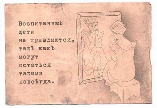 Zgodba je dobila nekaj odmeva in na kraju zločina občasno so se začele pojavljati vse vrste radovednežev. Dva študentje, ki so svoje vrste posneli na diktafon, so našli v zapuščena hiša starinska razglednica iz 19. stoletja, posvečena dobre manire. Na razglednici je bilo upodobljeno dekle pred seboj ogledalo in pokaže jezik svojemu odsevu. Napis na kartici preberi: