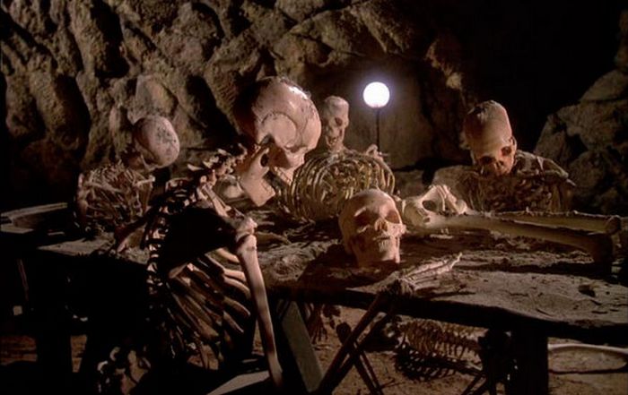 Po tem so se antropologi odločili prenočiti v jama, oborožena s pištolami in močnimi svetilkami. Ne glede na to ostali so jih skušali odvrniti, neustrašni znanstveniki so šli ječa, polna okostij. Tisto noč, ki je ostala zunaj prvič slišal veliko posnetkov, ki so hitro popustili, in potem znani zlobni zvoki trkanja kladivov …