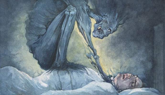 Črna figura, nič spominja na žensko, z ogromno, v pol obraza z očmi, ki gorijo rumen ogenj, ugrizi v vrat žrtve in skrivnostni zvok ni bil nič drugega kot škripanje zob na vratu vretenca nesrečnih. Moški je samo komaj slišno zastokal.