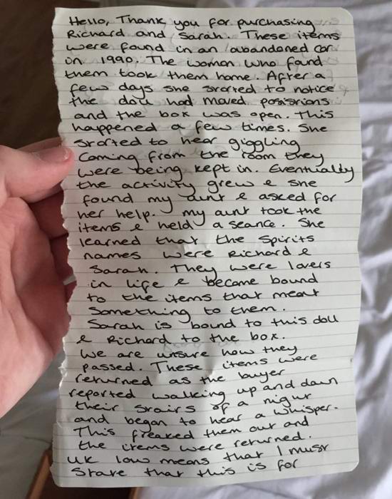 Lep pozdrav! Hvala, ker ste kupili Richarda in Sarah. Te predmete so našli leta 1990 v zapuščenem avtomobilu. Ženska ki je odkrila lutko in škatlo, jih je nenamerno odnesla k sebi domov. Nekaj dni kasneje je začela opažati, da je škatla se odpre in zapre sama od sebe in lutka spremeni svoje položaj. Tudi lastnik je začel slišati tihi smeh iz tega sobe, kjer so bile te stvari shranjene. Rezultat je nadnaravno aktivnost je postala tako močna, da se je ženska obrnila pomoč moji teti, ki je artefakte vzela k sebi in preživela s seboj njih spiritualistično zasedanje.