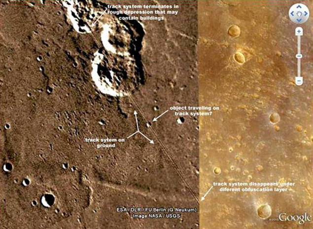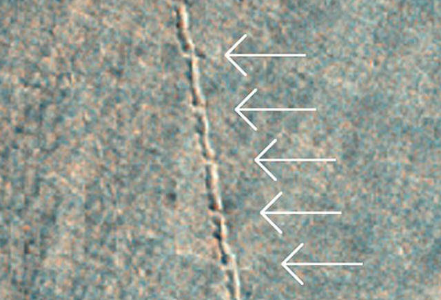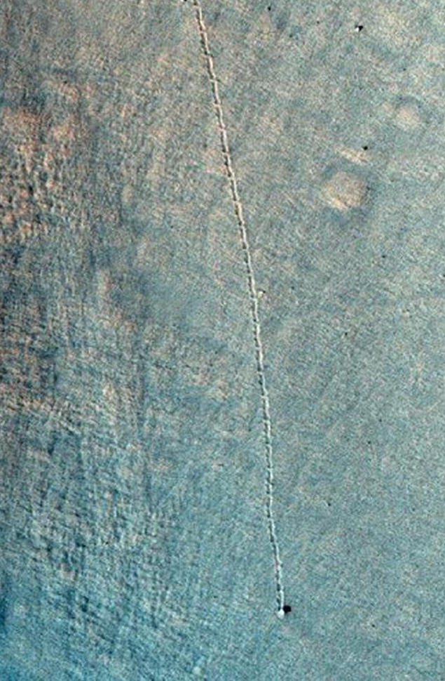 Seveda bi bilo naivno misliti, da vlaki potujejo po Marsu. Ampak kako razložiti, da se brazda v tej smeri razteza v tej smreki? Je vozil nazaj in nazaj? In zakaj tako čudna senca?