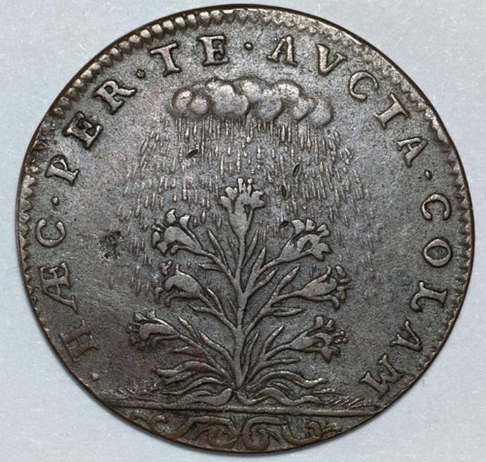 Na drugi strani je deževni oblak, ki preliva vodo na določen rastlina. Ufologi predlagajo, da bi se Francozi lahko zavezali aktivnost neznanih letečih predmetov s padcem padavine. Poleg tega ima kovanec latinski izraz “Opportunus adest”, ki ga lahko v ruski jezik prevedemo kot “Tu in ob pravem času.” Ali se nanaša na tujce strokovnjaki ne morejo reči.