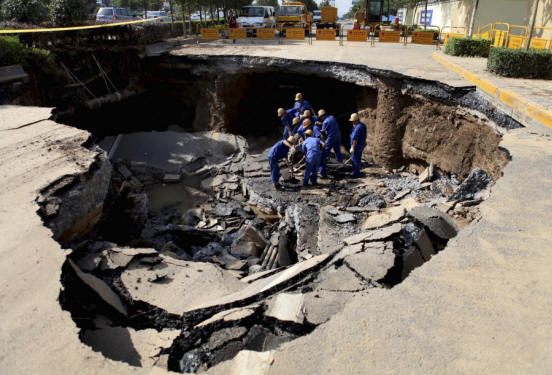 Maja 2012 zaradi propada tal na vozišču v ta provinca Shaanxi, Kitajska, se je pojavila dolga 15 metrov, 10 metrov široka in 6 metrov globoka.