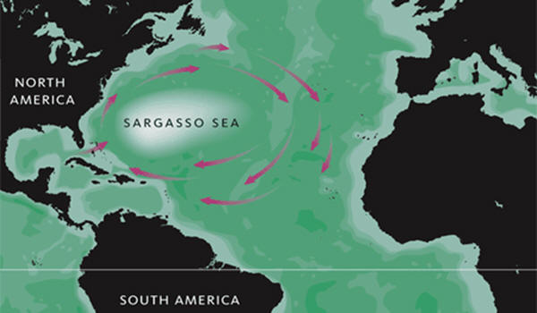 Ker se to morje nahaja sredi severnega dela Atlantski ocean, je edino morje, ki ga nima ima svoje obale. Obkroženo z oceanskimi tokovi, Sargassovo morje privlači smeti in zarašča z algami. Zaradi alge, nabiranje smeti in izolacija, ki jo ustvarjajo tokovi, voda v morju je zelo topla in mirna, kljub temu, da je morje obkrožena s spreminjajočimi se in hladnimi vodami oceana.