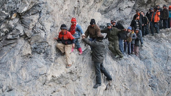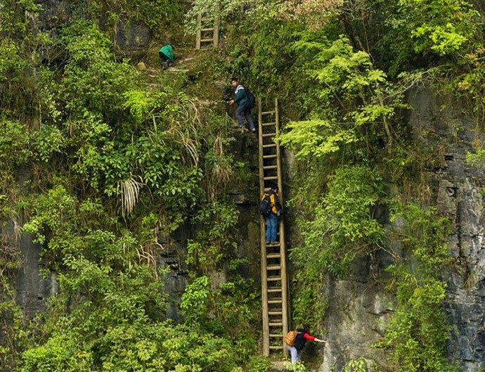 Na primer, v kitajski provinci Sečuan je majhna vas Gulu, katerega otroci morajo premagati ogromno oddaljenost do šole. Da bi bilo vse lažje test za otroke, odrasli so se skozi tunel podali po svoje s tem pa skrajšali pot. Vendar se sama sled v tem primeru razteza nad oborino in ponekod ne presega šestdeset centimetrov. Vaški fantje in dekleta morajo premagati to nevarno pot enkrat na teden, vse od šole deluje po principu internata, torej z zagotavljanjem nočitev in zagotavljanje hrane.
