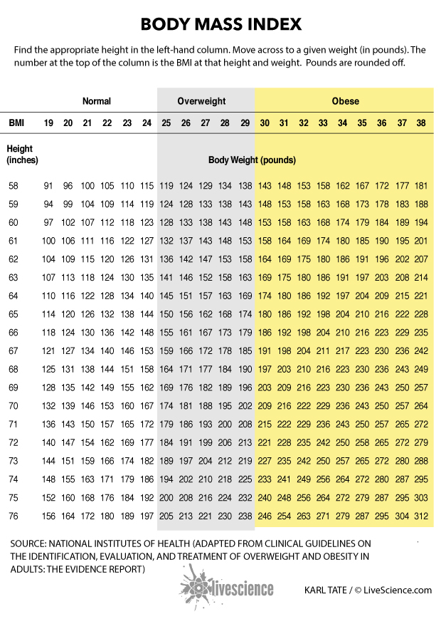 Ta tabela vam bo pomagala določiti razmerje telesne višine. in njegova masa – višji kot je indikator, bolj človek trpi odvečna teža. Navpična višina je v palcih (1 palčni – 2,54 cm), vodoravno – teža v kilogramih (1 kilogram – približno 0,45 kg).