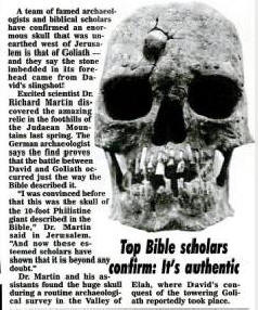 Ko so julija 1996 v dolini Ela, blizu Judejskih gora, arheolog dr. Simon Dore je odkril okostje bolj tri metre dolga, na čelu lobanje katere je bil kamen, od udarec, ki je ubil tega velikana. Presenečeni in presenečeni arheologi so se takoj spomnili biblijske zgodbe o Goljatu in spoznali da pred njimi očitno leži natančno njegovo okostje pripoveduje svetopisemsko projekt bible-facts.ru