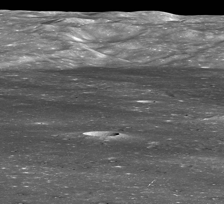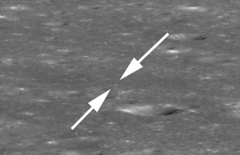 Ko zavijemo proti zahodu in se čim bolj približamo možna razdalja do Carmen Crater, kjer je pristal kitajski modul z lunarnim roverjem Yuta-2, sondo LRO je uspelo ujeti “zajec” v objektiv njegove kamere. Res je, da je lunarni rover viden samo kot bela pika (poglej med puščice), ker zato velika razdalja do 330 kilometrov (letenje ni bližje uspelo), velikost predmeta na sliki zavzame le dva slikovna pika.