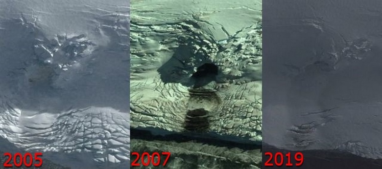 Če se obrnemo na koordinate 62 ° 0’29,99 “S 57 ° 45’14,86” Z Googlova storitev zemljevidov (to je Greenwich Island) in nato naprej na fotografijah iz leta 2005 je mogoče videti, kot da se nekaj zlomi snežno-ledena stena. In na fotografijah iz leta 2007 je “nekaj” Zdi se, da je že “pobegnil” iz skrivne podzemne baze, ker v tem kraj tam je ogromna jama, vhod v katero je približno 75×75 metrov in velikost predmeta približno 14 metrov.