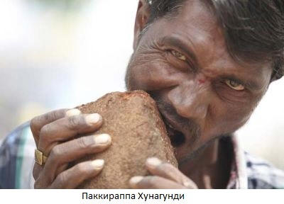 30-letna indijska Pacquirappa Hunagundi jedo že več kot 20 let kamni, pesek, kovina in samo zemlja. “Izdelki” prevzamejo gradbišča, kjer delavec dela. Vsak dan poje vsaj 3 kg, izpiranje s kozarcem vode. Na prepričanje matere to odgovori kamni so veliko okusnejši od celo ocvrtega piščanca in zavrniti jih ni gredo na. Na presenečenje zdravnikov ima zdravo prebavo sistem in ravno popolni zobje. Pred kratkim Pakkirappa začel razmišljati o karieri pop izvajalca in že načrtuje gostovanje po državi. Jem vse!