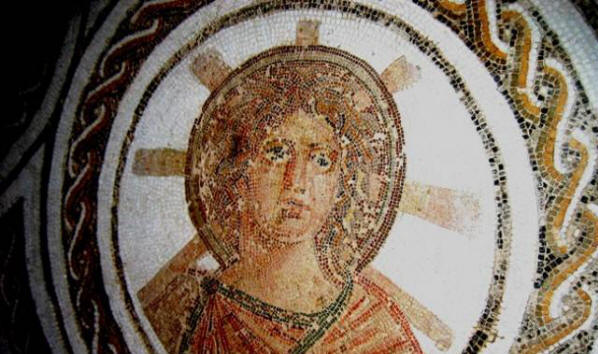 Apolon z sijočo halo v rimskem mozaiku (konec II. Stoletja, El Diem, Tunizija)