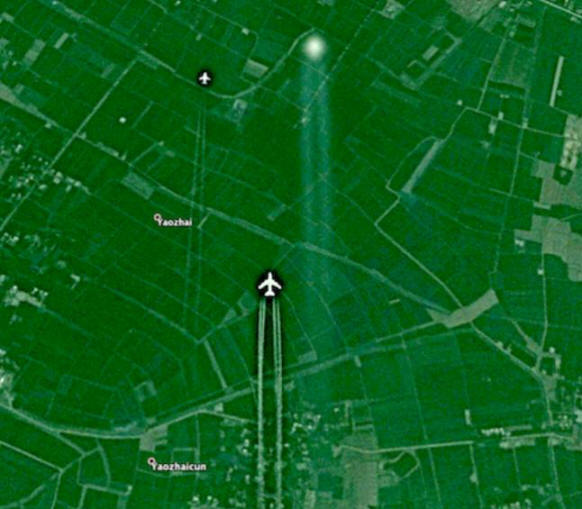 Scott Waring poroča o nenavadni podobi, ki jo je našla ena z Googlovih zemljevidov na ozemlju Kitajske. Obstajata dve letalo in kakšen bel zaobljen predmet.