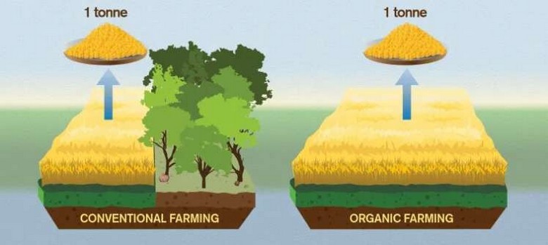 Dejstvo je, da avtorji pišejo, da so organske kulture brez že znana kemična gnojila so nižja pridelki, zato potrebujemo velike površine, visoki stroški energije vodijo do večjega krčenja gozdov in v na koncu za večje emisije CO2. Kar zadeva ekološka živina (za pojasnitev) potem zahteva ekološko gojenje polja in je zato značilno praktično enake slabosti.