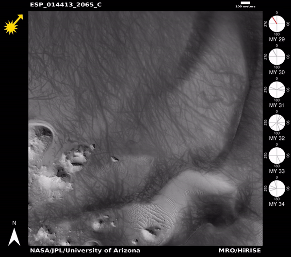 Na sliki so prašni hudiči pustili sledi na dnu kraterja, valovite peščene sipine pa dodajajo umetniški pridih. Ko se prašni hudiči premikajo po površini, vpijejo svetlejši barvni material in pustijo sledi temnejšega, izpostavljenega materiala.