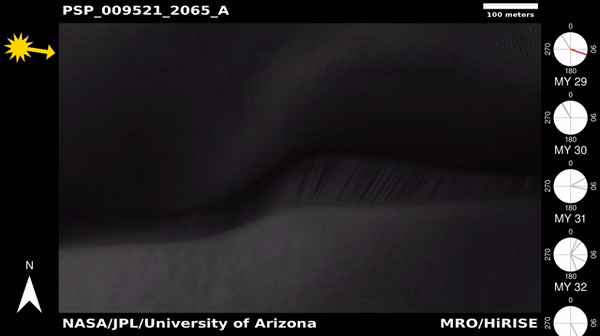 Tudi peščene sipine na Marsu se nenehno spreminjajo. Naslednja animacija se osredotoča na štiri majhne sipine, ki se spreminjajo skozi zaporedje.