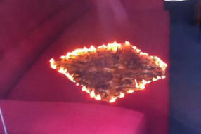 “To je ognjevarna kavč, na srečo, zato ni slabo opečen. Ne vemo pa, kaj je povzročilo požar: laserski kazalec oz. morda povečevalno steklo ali pa tudi sonce svetel? ”