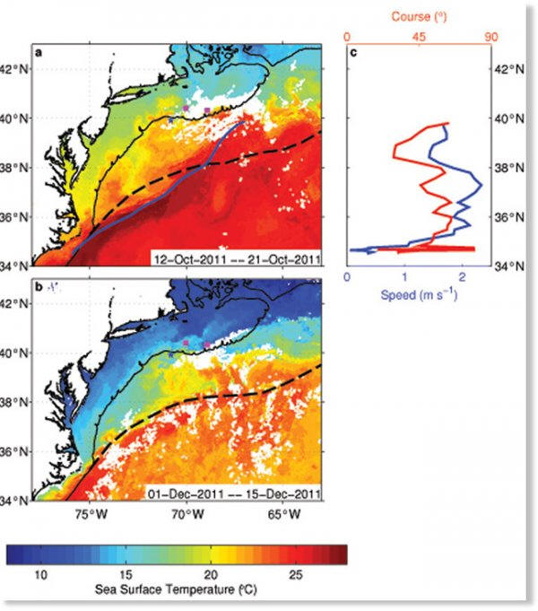 Spremembo lokacije Golfstim smo določili z uporabo posebni drifterji izstreljeni v ocean. Upočasnili in pospešili hitrost, odvisno od toplote vode. Toplejša voda ustrezala mejam toka, katerega središče je zdaj v koordinate 39,9 ° S; 68 ° Z, kar je 200 km severno od normale. Taki obsežni premik tako velike mase tople vode in povečanje njegova temperatura vsaj 2 ° C bo kmalu vplivala na vse prebivalci morja. Populacije srebra osliča so se že preselile spomladi 2012, precej prej selitev modroplava in črtasti ostriž, katerega džabe so se oddaljile od obale koda ogrinjala Nadalje napovedati in ugotoviti vzroke za premik v Zalivski tok potrebuje podrobnejšo študijo sprememb, zgodilo z Zalivskim tokom.